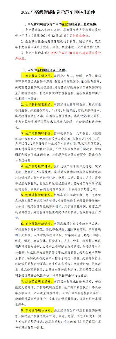為深入貫徹省委、省政府關于加快推動江蘇制造業高質量發展走在前列的總體部署,認真落實《江蘇省制造業智能化改造和數字化轉型三年行動計劃(2022-2024年)》有關要求,引導企業加大智能化改造投入力度,切實提升企業智能制造水平,現就組織開展2022年省級智能制造示范車間申報工作有關事項通知如下: